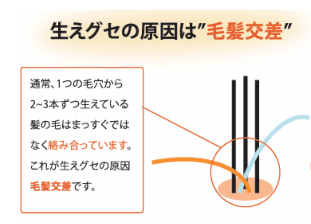 生え癖により、同じ毛穴から生えている髪同士が交差し、絡み合う事でボリュームが出ない。