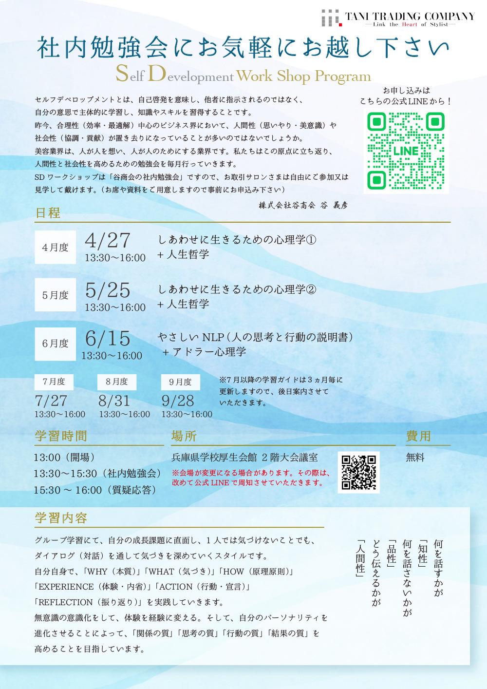 セルフデベロップメントとは、自己啓発を意味し、他者に指示されるのではなく、自分の意思で主体的に学習し、知識やスキルを習得することです。昨今、合理性(効率・最適解)中心のビジネス界において、人間性(思いやり・美意識)や社会性(協調・貢献)が置き去りになっていることが多いのではないでしょうか。美容業界は、人が人を想い、人が人のためにする業界です。私たちはこの原点に立ち返り、人間性と社会性を高めるための勉強会を毎月行っていきます。